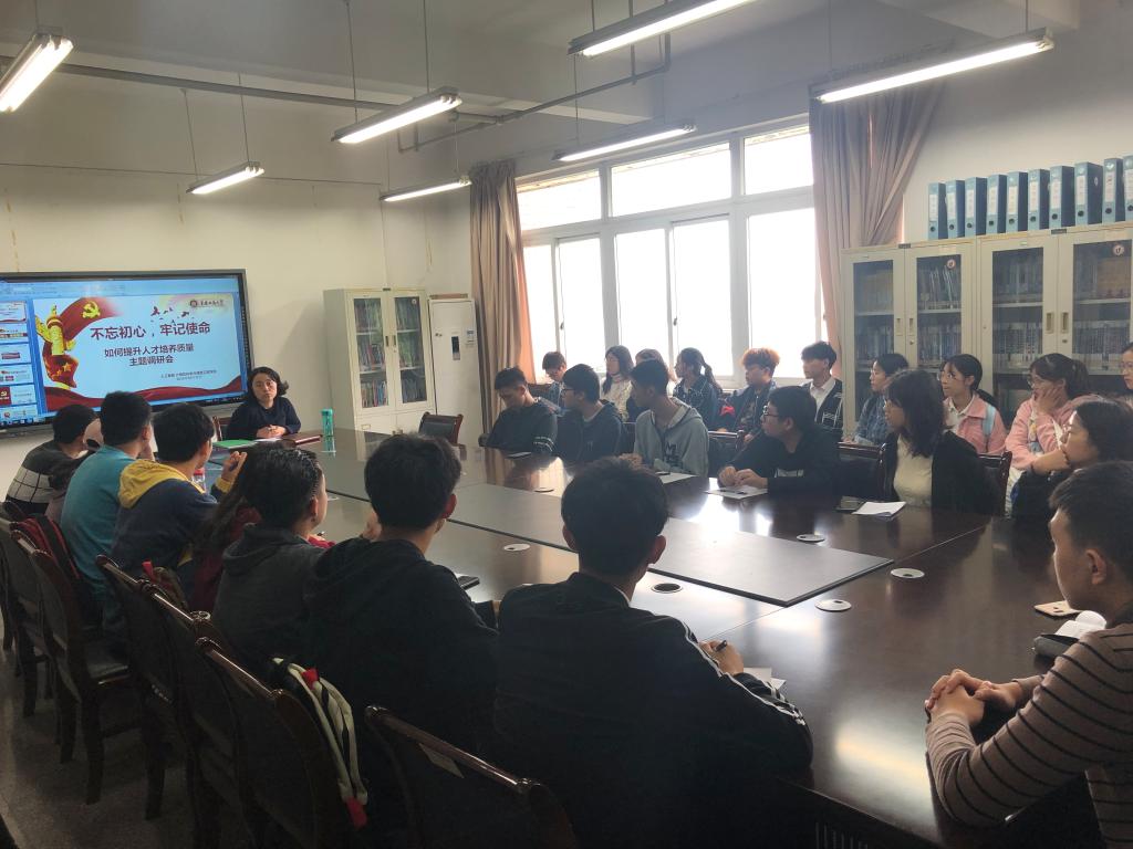 首先,陈书记介绍了召开此次座谈会的目的和意义。她指出,学校教育要以学生为本,本次“不忘初心、牢记使命”主题教育调研会主题“如何提升人才培养质量”,希望通过座谈会的方式听取学生在专业学习、学生管理、创新创业等方面工作的意见和建议,了解学生在学习、生活、心理等方面的诉求,并针对具体问题提出解决措施。
