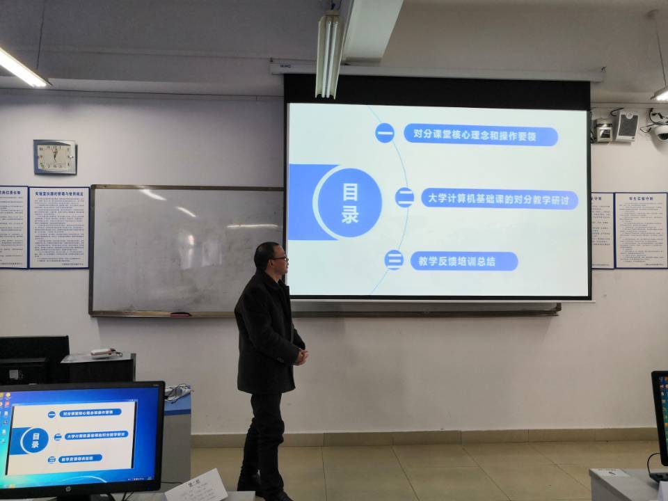 2020年1月7日下午,由必赢3003no1线路检测中心教师发展中心主办,必赢线路检测3003、计算机科学与信息工程学院承办,大学计算机教学部和计算机应用实验教学中心协办,我院梁新元教授主讲的“对分课堂实务操作与大学计算机基础教学改革研讨会”在启智楼80402机房举行。我院大学计算机教学部、测控与自动化系、电子信息工程系、应用物理系和我校文新学院和管理学院共计30位老师参加了本次研讨会。