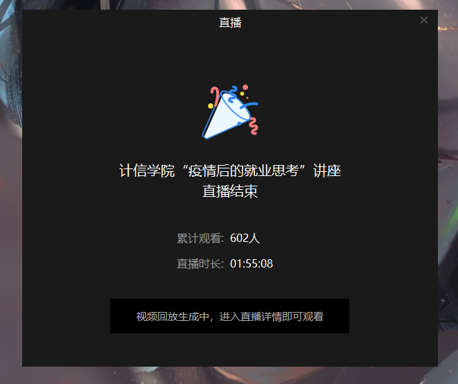 王刚校友主要从当前国际形势对中国的影响、中国经济形势对就业的影响、大学生应该秉持什么样的就业观(包含社会和用人单位的需求、就业城市和行业的选择等)、疫情下的就业机会、不同年龄阶段的发展任务等几个维度深刻地阐释了自己的观点和建议。一个半小时的讲座干货满满,同学们收获颇丰。最后,王刚校友耐心细致的解答了同学们在学业和职业生涯规划中遇到的困惑,为整场就业交流讲座划上了圆满句号。本次活动吸引了共600余人次的观看,受到了同学们的一致好评。