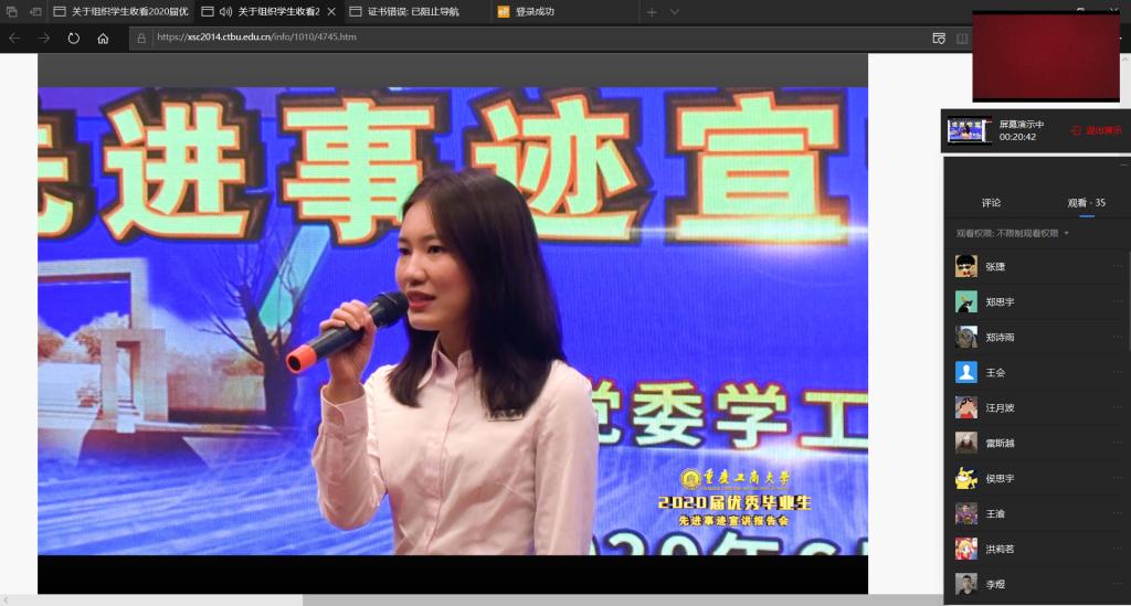 18级辅导员李菁谈到:这场“屏对屏”的特殊宣讲会,让每位师生都能一睹优秀工商学子的风采。在12个满载成长、奋斗、超越、逐梦的青春故事里,我们看见了一场场经历四年时光,从懵懂到成熟、从迷茫到坚定的美丽蝶变。对于一名辅导员而言,优秀毕业生先进事迹宣讲会就是一个生动的素材库,让更多学生汲取榜样的力量,努力从今天的“观者”成为明天的“主讲人”,让优秀流行起来!