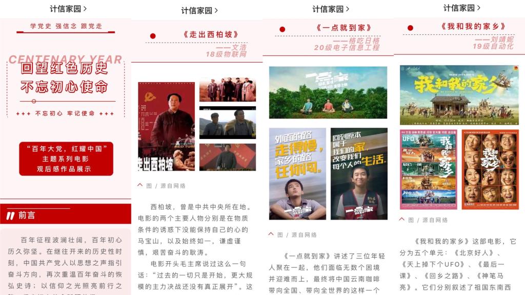 在“百年大党,红耀中国”主题观影活动中,通过观看《走出西柏坡》、《邓小平1928》、《我和我的家乡》等影片,同学们以笔抒情,纷纷在观后感中回顾党的奋斗历史,讴歌党的光辉业绩,抒发爱党之情。