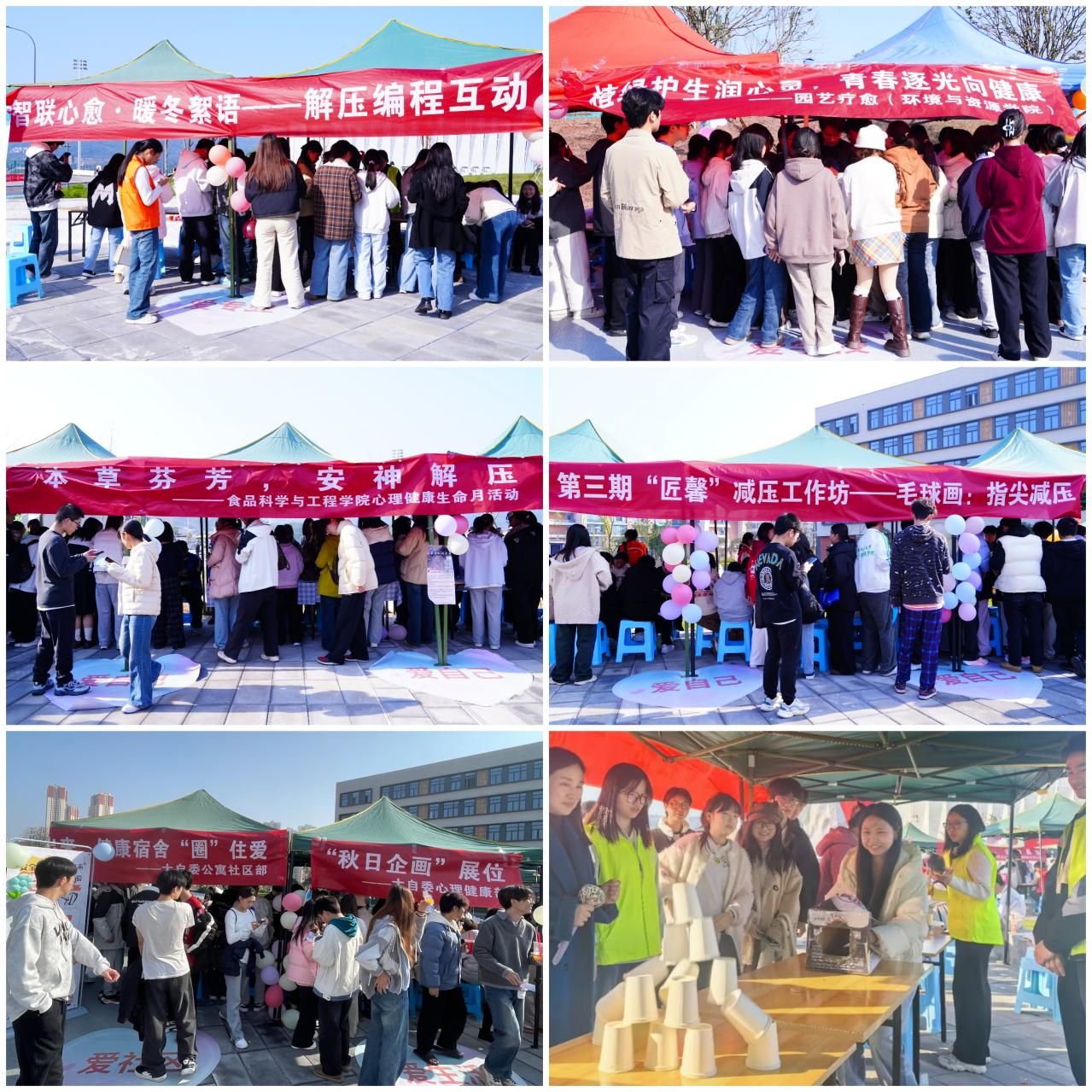 作为学校深化“一站式”学生社区综合管理模式建设的重要举措,本次活动以“关爱生命健康,绽放青春光彩”为主题,深度融合茶园校区四大工科学院的专业特色,精心规划出“爱自己、爱生活、爱学校、爱社区、爱专业”五大互动展区。在“爱自己”展区内,毛球画指尖解压让同学们在色彩拼贴中找寻内心平静,本草安神手工则借助中草药香囊制作,传递传统养生智慧。“爱生活”展区人流如织,“秋日企画”鼓励大家用创意拼贴捕捉季节之美;“解忧杂货铺”则通过匿名倾诉与互助建议,成为同学们释放压力、获取支持的有效窗口。“爱学校”展区的园艺种植活动,让师生在亲近自然时感悟生命成长。“爱社区”展区的安全“慧眼”套圈游戏,巧妙地将安全知识融入趣味互动,旨在提升学生的安全防范意识。在“爱专业”展区,解压空气大炮让师生通过参与物理实验释放压力,感受科学乐趣;编程解压互动则借助数字技术,为情绪疏导与压力管理开辟了新路径。除上述各展区准备的精美小礼品外,同学们还参加了贯穿全程的趣味游园集章活动,完成相应任务即可参与惊喜抽奖,进一步增添了活动的互动性与吸引力。