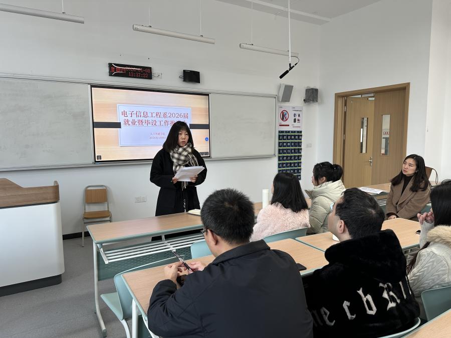 2026 年 1 月 8 日下午,电子信息工程系在臻智楼 307 教室成功组织召开了电子信息工程专业 2026 届就业暨毕设工作推进会。此次会议聚焦毕业生就业与毕业设计工作,旨在凝聚各方力量,为毕业生就业与学业发展保驾护航。学院党委副书记张未亲自主持会议,辅导员徐国平、就业指导老师孙金兵以及负责毕业生毕业设计和帮扶工作的老师齐聚一堂,共同研讨就业帮扶良策。