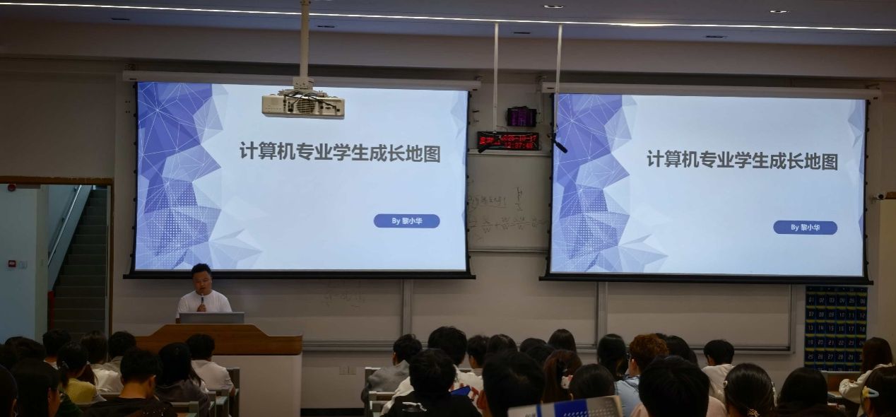 讲座伊始,黎小华校友以“计算机专业学生成长地图”为引,指出大学不仅是学术殿堂,更是人生成长的舞台,在这里获得的经验、教训和人际关系都是人生的重要财富。随后,他从大学生活、专业学习、专业方向、未来规划四个方面分享,结合自身实习与工作经历,剖析了C语言、Java、Python等主流编程语言在知识体系构建以及未来就业方面的不同作用,激励大家不仅要能编写代码,更要领会代码背后的原理与思想。