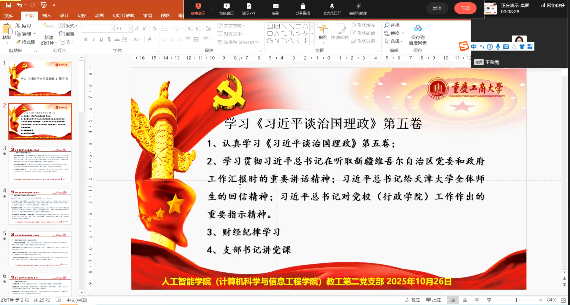 2025年10月26日晚8点,教工第二党支部举行了10月主题党日活动。此次活动通过企业微信线上直播的方式进行,会议由王荣秀书记主持,教工第二党支部全体党员参加了会议。