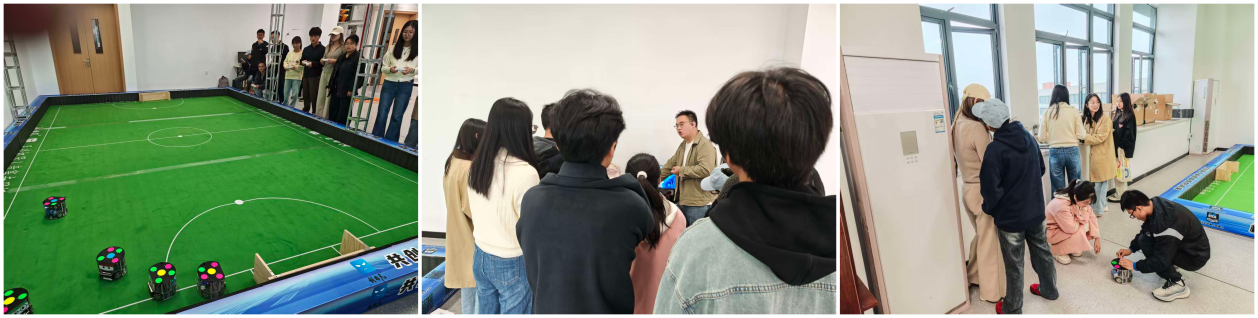 B401实验室配置的足球机器人平台具备完善功能,能够全面支持我校代表队备战中国机器人及人工智能大赛、睿抗机器人开发者大赛以及中国大学生工程实践与创新能力大赛等重要赛事。培训内容系统全面,涵盖七大模块:首先介绍了足球机器人的硬件结构,包括底盘、控球装置与射门机构等关键部件;随后讲解了机器人控制系统及电路板的基本功能;在软件应用方面,重点演示了操作管理系统的使用方法与策略脚本管理机制;此外,还涉及视觉识别系统的配置与调试方法,以及机器人的运动控制、角色分配与多机协同策略;培训还专门设置了比赛模式讲解与实战模拟环节,并针对常见故障排查与设备维护方法进行了指导。